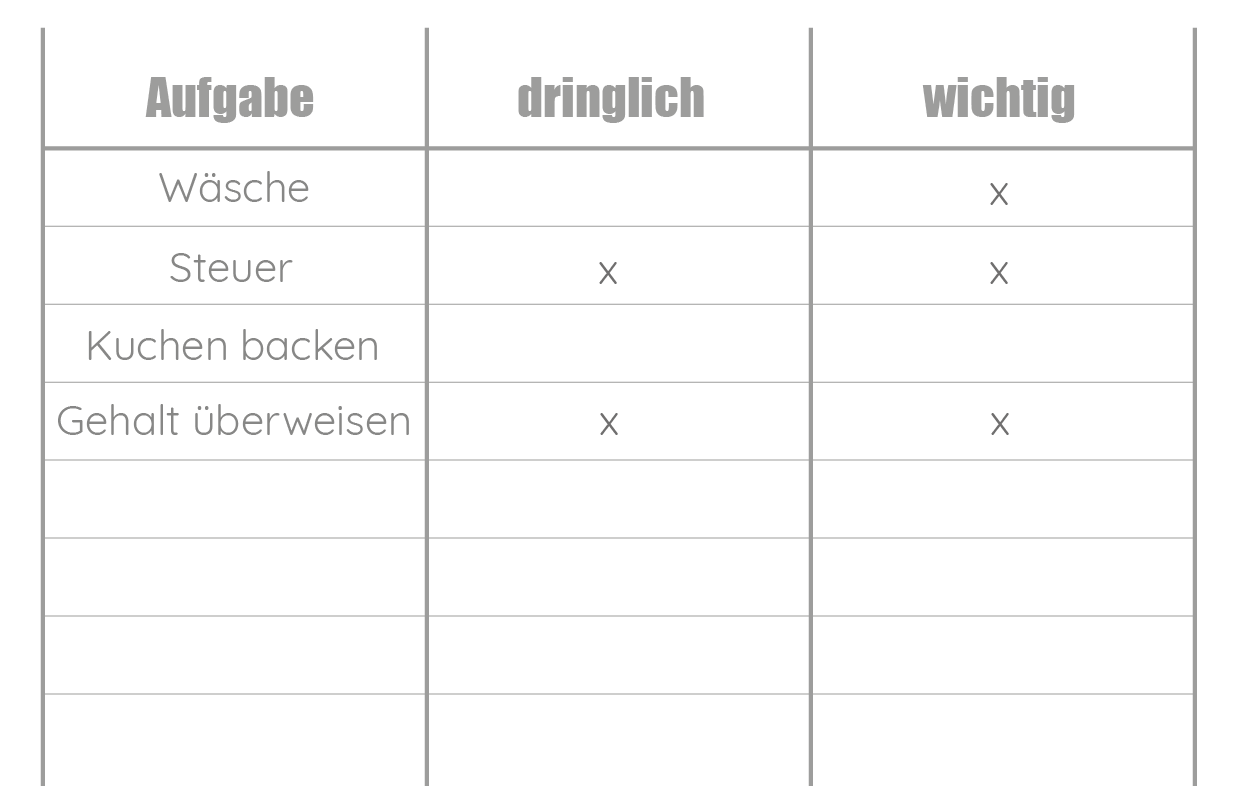 Was zwei Kreuzchen hat, das wird zu erst erledigt und was kein Kreuzchen hat, darf auch gerne für später liegen bleiben.